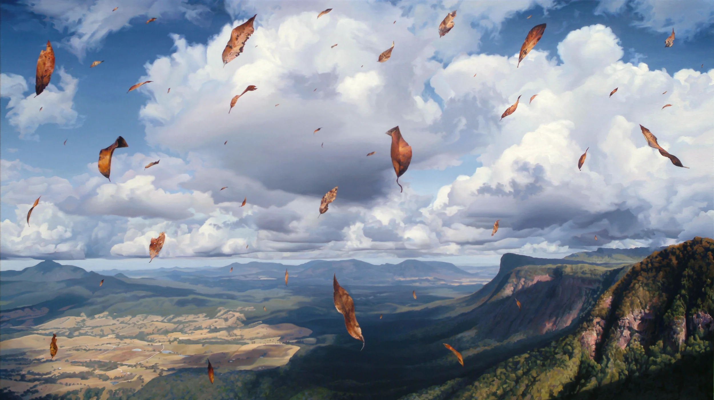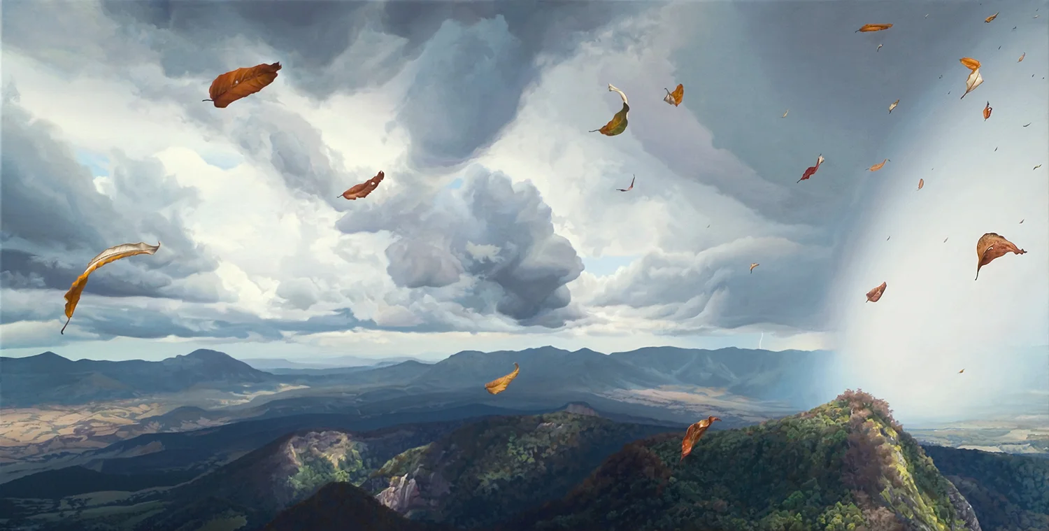 The title of the exhibition is a clear indication of the artist’s employment of extremes, and mirrors a central irony depicted in this body of work. The collection of paintings presents a perplexing quandary; how is it that the leaves are all falling downwards from the clouds instead of fluttering upwards, as they usually and logically should be? This unexpected imagery suggests that something is askew, that all is not right in the natural world, and Porter thus sets the stage for an intriguing drama. The metaphorical storm clouds are definitely looming. Above the sublime landscapes, which symbolise all that is beautiful and perfect in nature, hover crispy, impossibly dry leaves representing the rain that cannot fall to nourish the land below. It is difficult to discount the importance of these leaves as harbingers of an uncertain future.